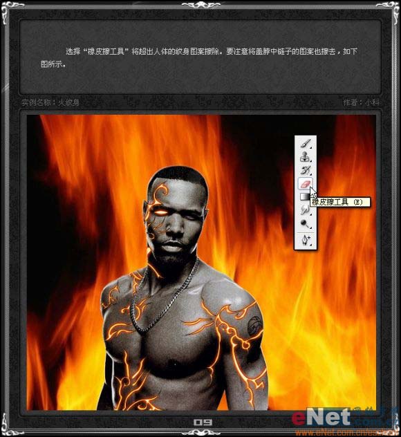 | 9、选择“橡皮擦工具”将超出人体的纹身图案擦除,要注意将盖脖中链子的图案也擦去,如下图所示。 |