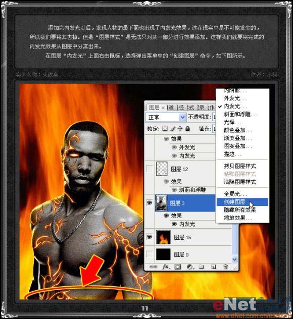 | 11、添加完内发光以后,发现人物的最下面也出现了内发光效果,这在现实中是不可能发生的,所以我们要将其去掉,但是“图层样式”是无法只对某一部分进行效果添加,这样我们就将完成内发光效果从图层中分离出来,在图层“内发光”上面右击鼠标,选择弹出菜单中的“创建图层”命令,如下图所示。 |