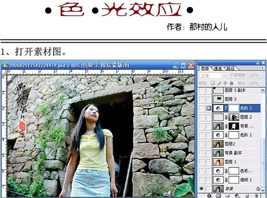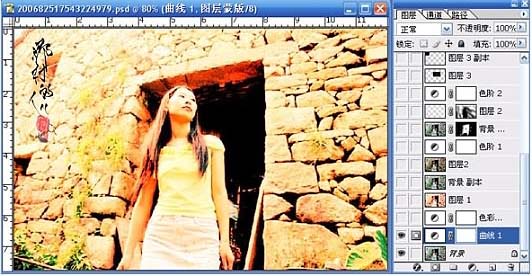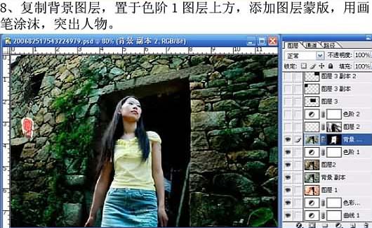 | 8、复制背景图层,置于色阶1图层上方,添加图层蒙版,用画笔涂抹,突出人物。 |