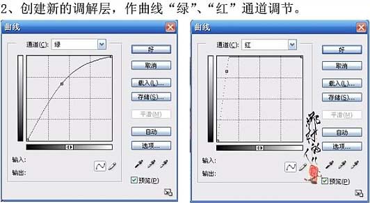 | 2、创建新的调解层,作曲线“绿”、“红”通道调节,参数设置如下图: |