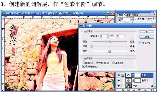 | 3、创建新的调解层,作“色彩平衡”调节,参数如下图设置: |