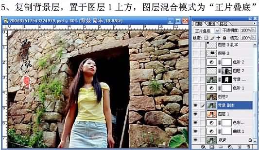 | 5、复制背景层,置于图层1上方,图层混合模式为“正片叠底”。 |