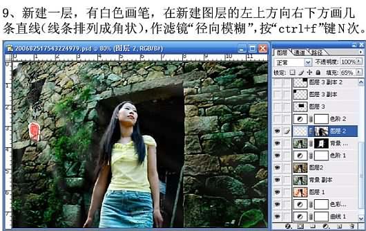 | 9、新建一层,用白色画笔,在新建图层的左上方向右下方画几条直线(线条排列成角状),作滤镜-模糊-径向模糊,按“ctrl+f”键N次。 |