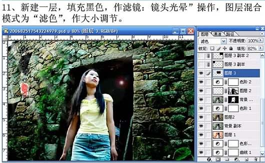 | 11、新建一层,填充黑色,作滤镜-渲染-镜头光晕操作,图层混合模式为“滤色”,作大小调节。 |