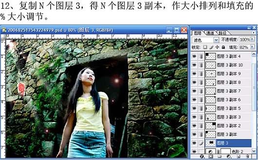 | 12、复制N个图层3,得N个图层3副本,作大小排列和填充的%大小调节。 |