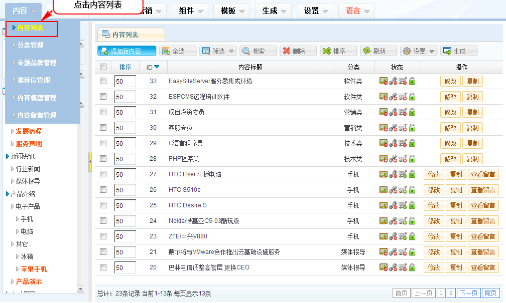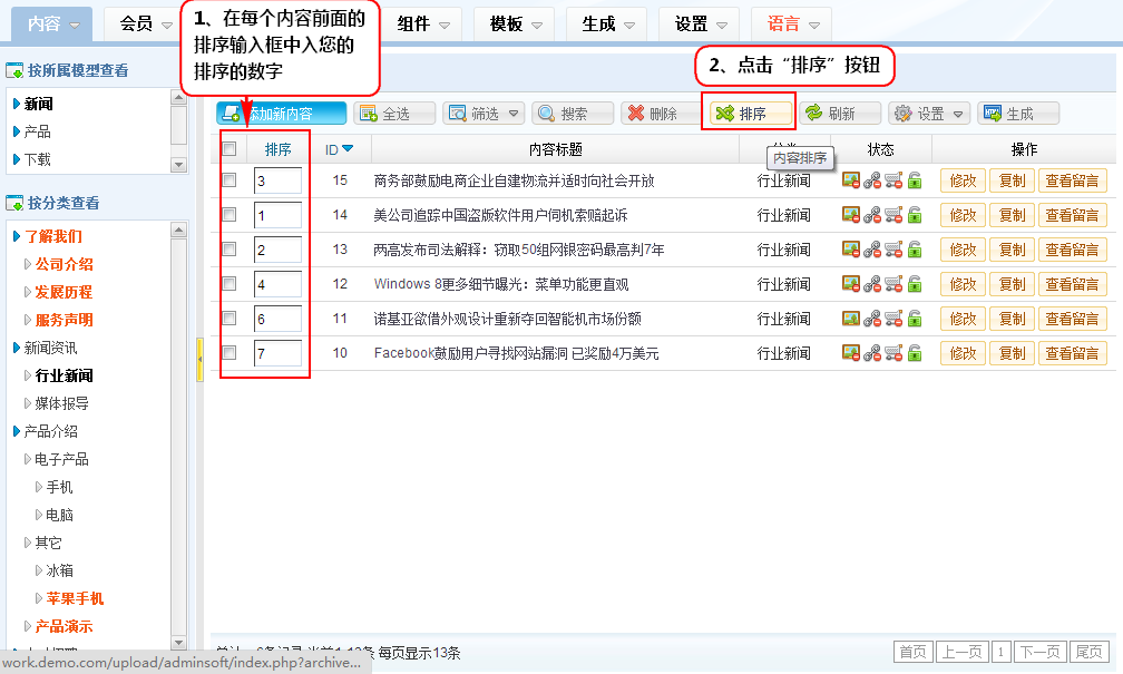 2、在内容列表区中,在每个内容前面的排序输入框中入您的排序的数字,然后点击功能区的“排序”按钮。