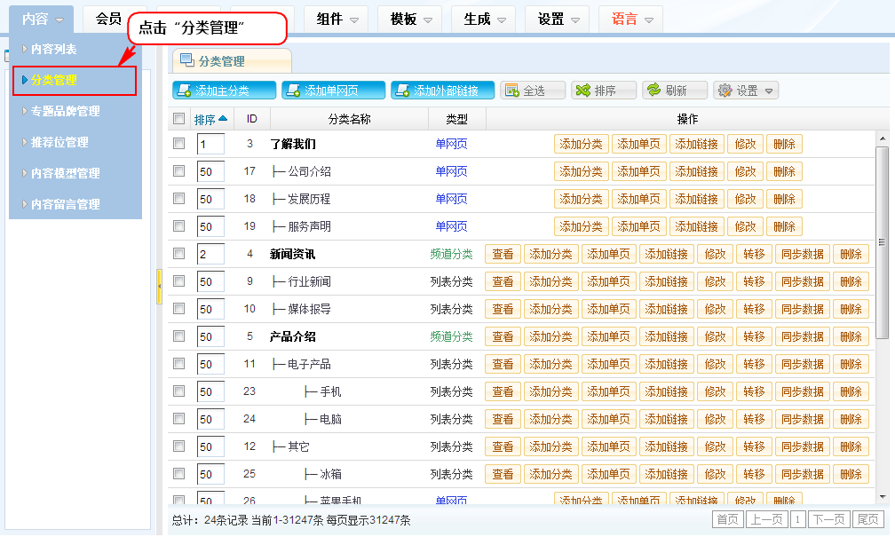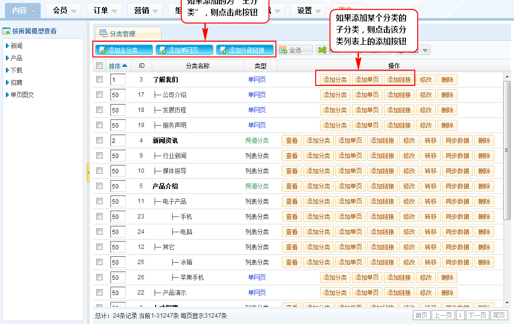 添加主分类:用于列表性内容的展示,如新闻、产品、技术文档等列表性翻页内容;