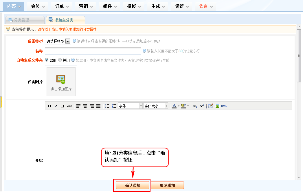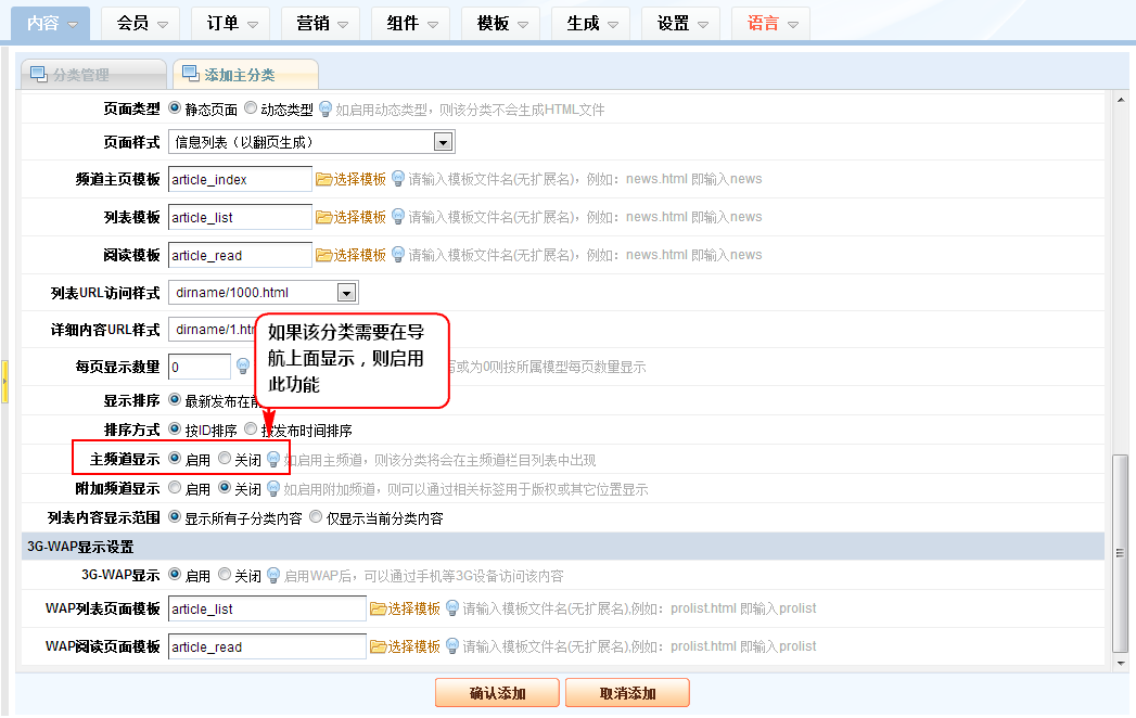 3、在出来的分类添加窗口中,按各字段的提示要求填写好相应的内容,如该分类要在网站主导航显示,推荐开启“主频道显示”字段,其它附加频道和WAP显示采用同样操作方式,添加好内容后,点击”确认添加“则完成添加工作。