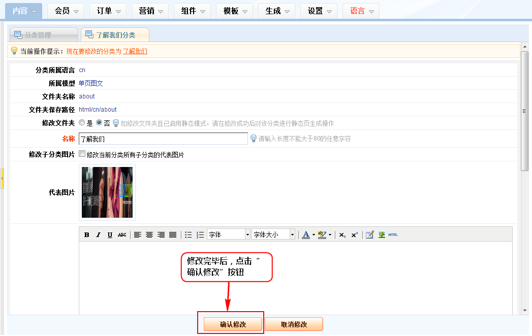 3、在出来的分类修改窗口中,修改当前分类属性,点击“确认修改”按钮。