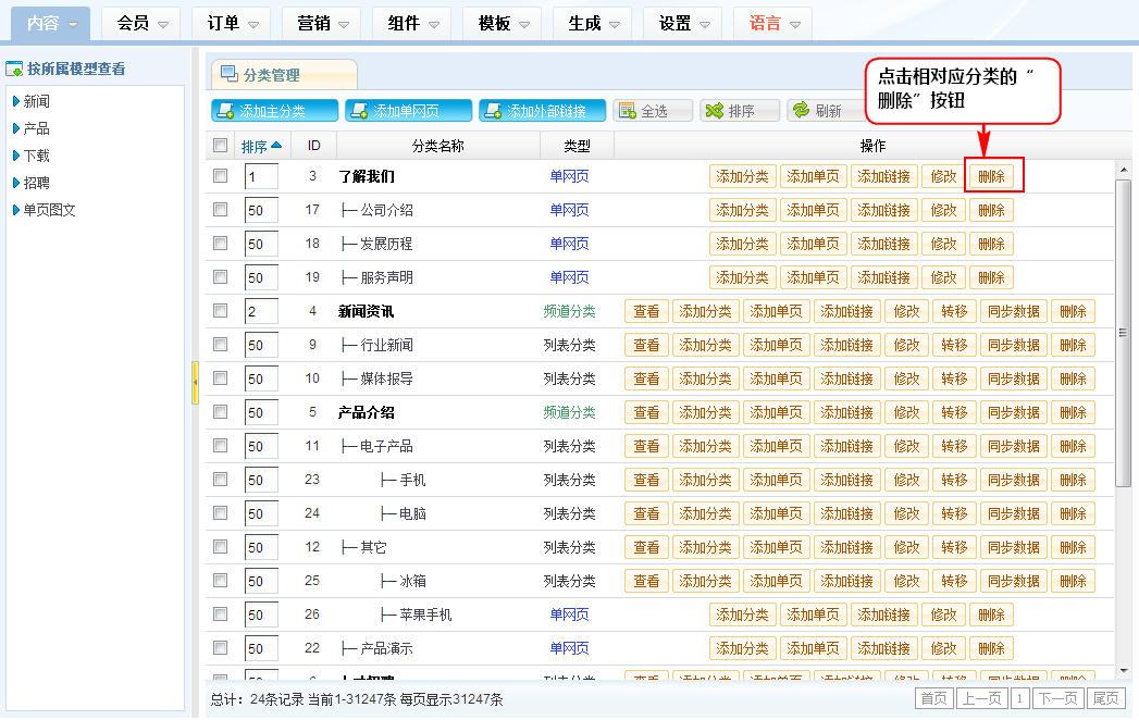 2、在分类列表区,点击相对应分类的“删除”按钮即可,注意:分类删除后,该分类下面的所有内容和子分类都会相应删除,不可恢复,请谨慎操作!