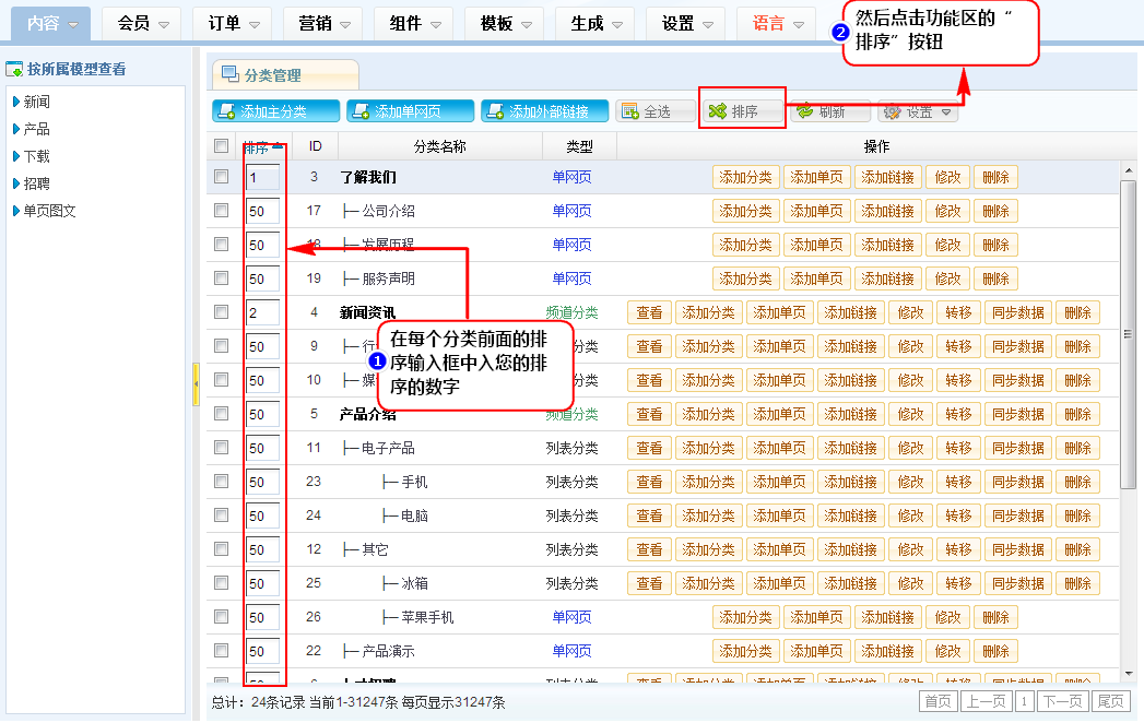 2、在分类列表区中,在每个分类前面的排序输入框中入您的排序的数字,然后点击功能区的“排序”按钮。