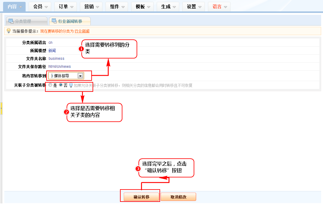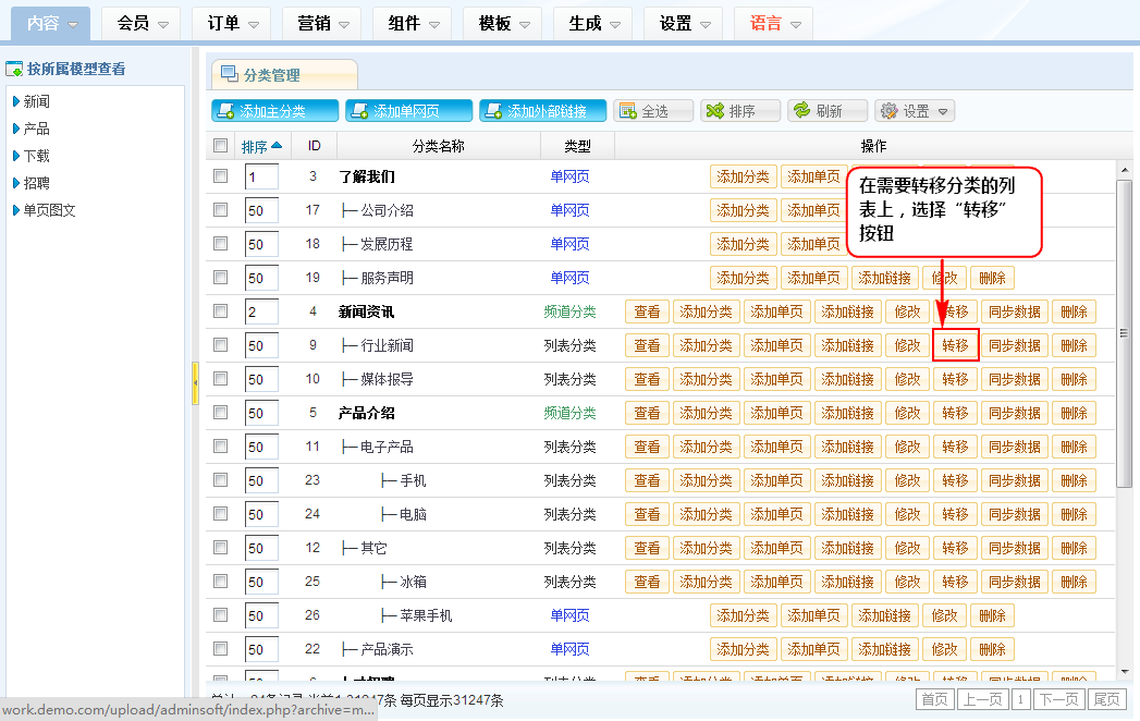 分类转移是指将一个分类中的数据移到另一个分类当中,转移数据必须为同模型中的分类,不同模型中的分类数据不能进行转移。
