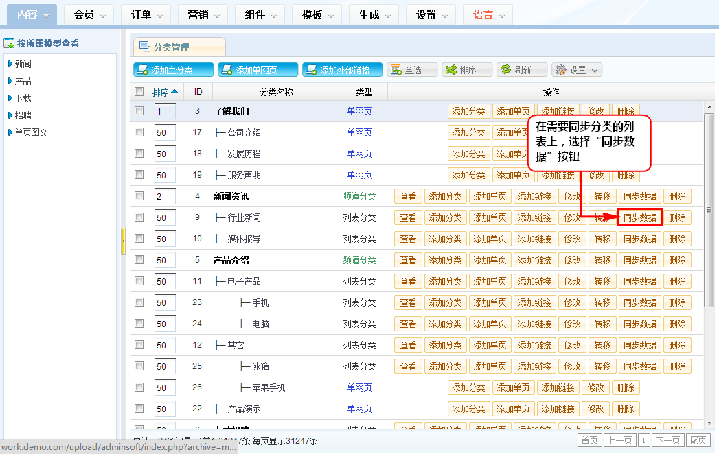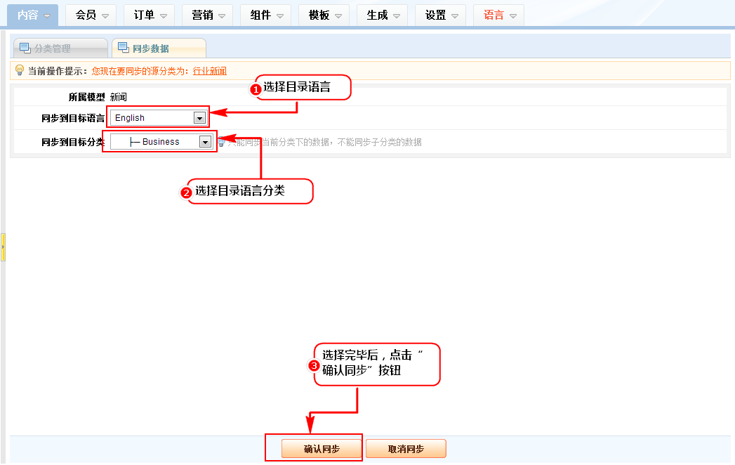 分类同步是指将一个分类中的数据复制到另一个分类当中,同转移数据一样,同步数据也只能同步到相同模型分类当中,同步数据大多数用于提高重复发布数据的效率,比如A语言中有相机产品,B语言中也有同样的相机产品,他们除了标题语言不一样,其它属性一样,则可以采用同步数据操作,来减产重复数据的发布,而同步后,仅需要修改另一个产品的标题即可。