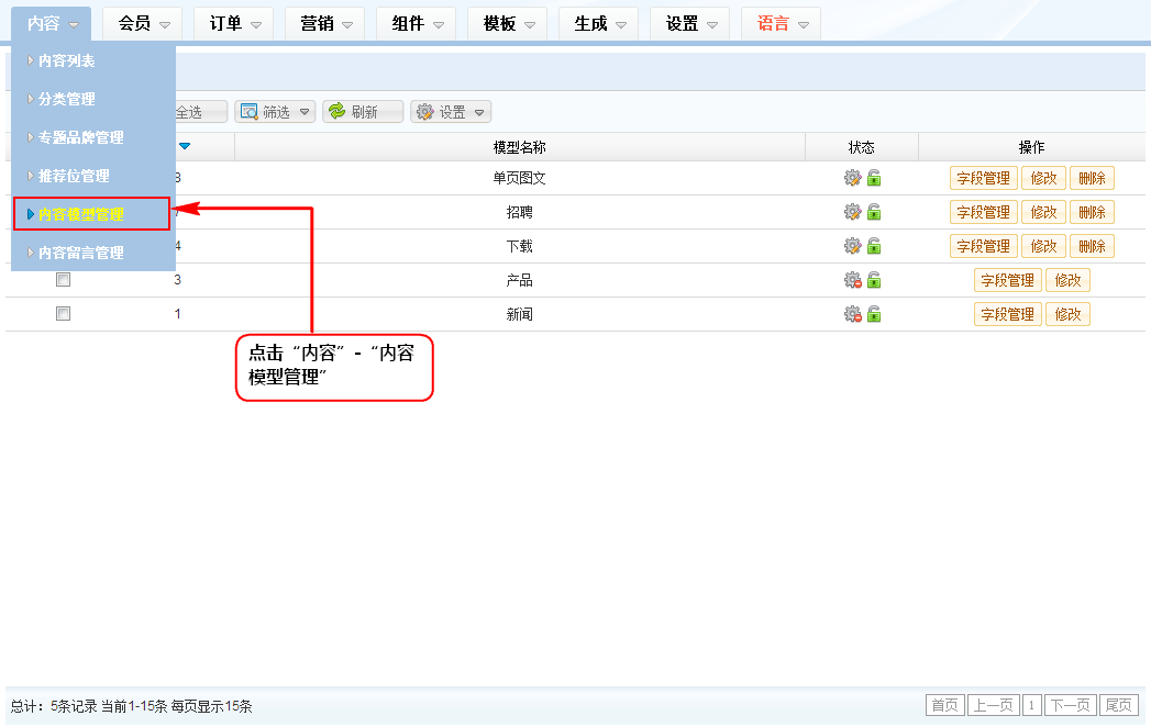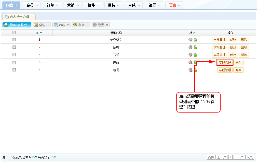 2、在出来的模型列表窗口中,点击您需要管理的模型列表中的“字段管理”按钮;