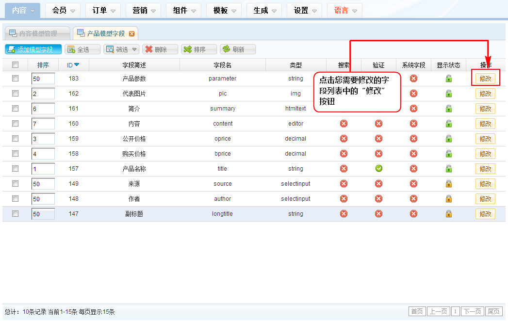 3、在出来的模型字段列表窗口中,点击您需要修改的字段列表中的“修改”按钮;