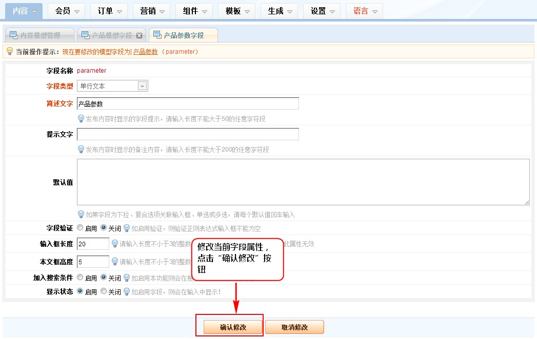 4、在出来的字段修改窗口中,修改当前字段属性,点击“确认修改”按钮。