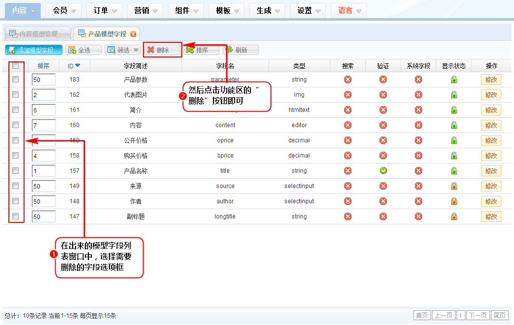 3、在出来的模型字段列表窗口中,选择需要删除的字段选项框,然后点击功能区的“删除”按钮即可,注意:字段删除后,该字段下面的所有字段及字段内容会相应删除,不可恢复,请谨慎操作!系统保留默认字段不允许删除;