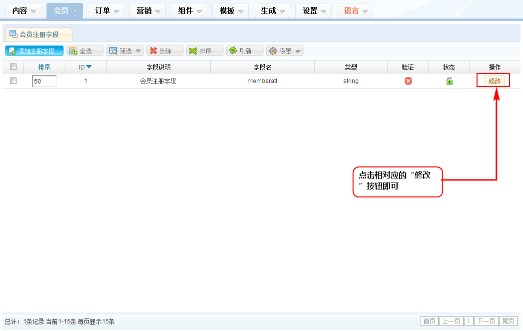 2、在会员注册字段列表区双击您要修改的会员注册字段,或者点击相对应的“修改”按钮即可。