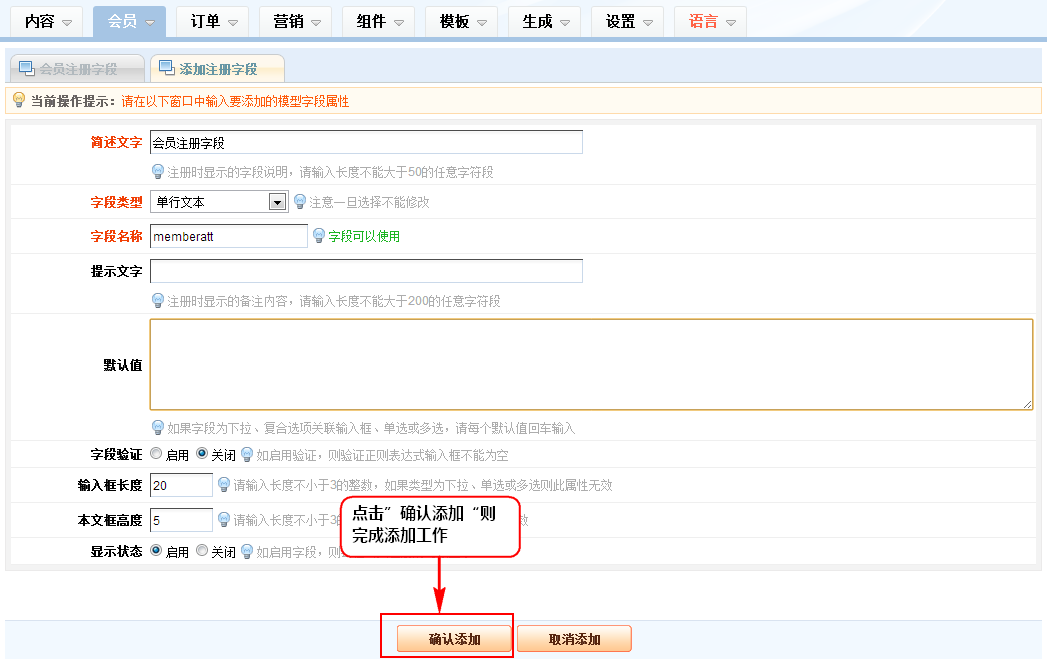 3、在出来的添加注册字段窗口中,按各字段的提示要求填写好相应的内容,然后点击”确认添加“则完成添加工作,有关注册字段的功能描述如下。