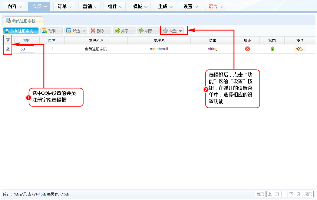 2、在会员注册字段列表区,选中您要设置的会员注册字段选择框,选择好后,点击“功能”区的“设置”按钮,在弹开的设置菜单中,选择相应的设置功能。
