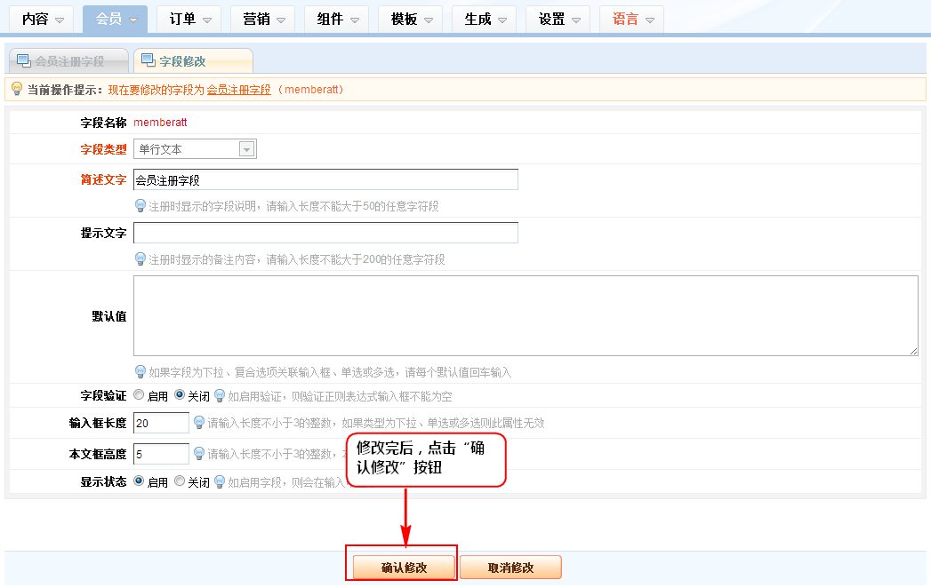 3、在出来的会员注册字段修改窗口中,修改当前会员注册字段信息,点击“确认修改”按钮。