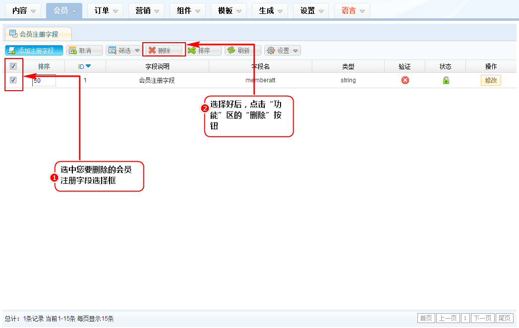 2、在会员注册字段列表区,选中您要删除的会员注册字段选择框,选择好后,点击“功能”区的“删除”按钮。