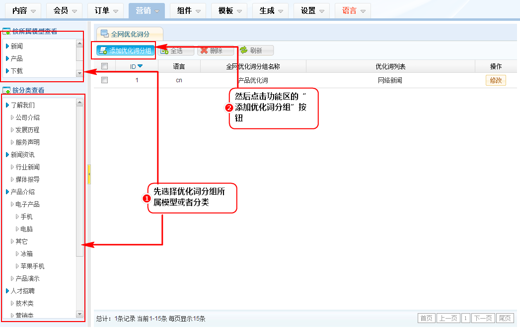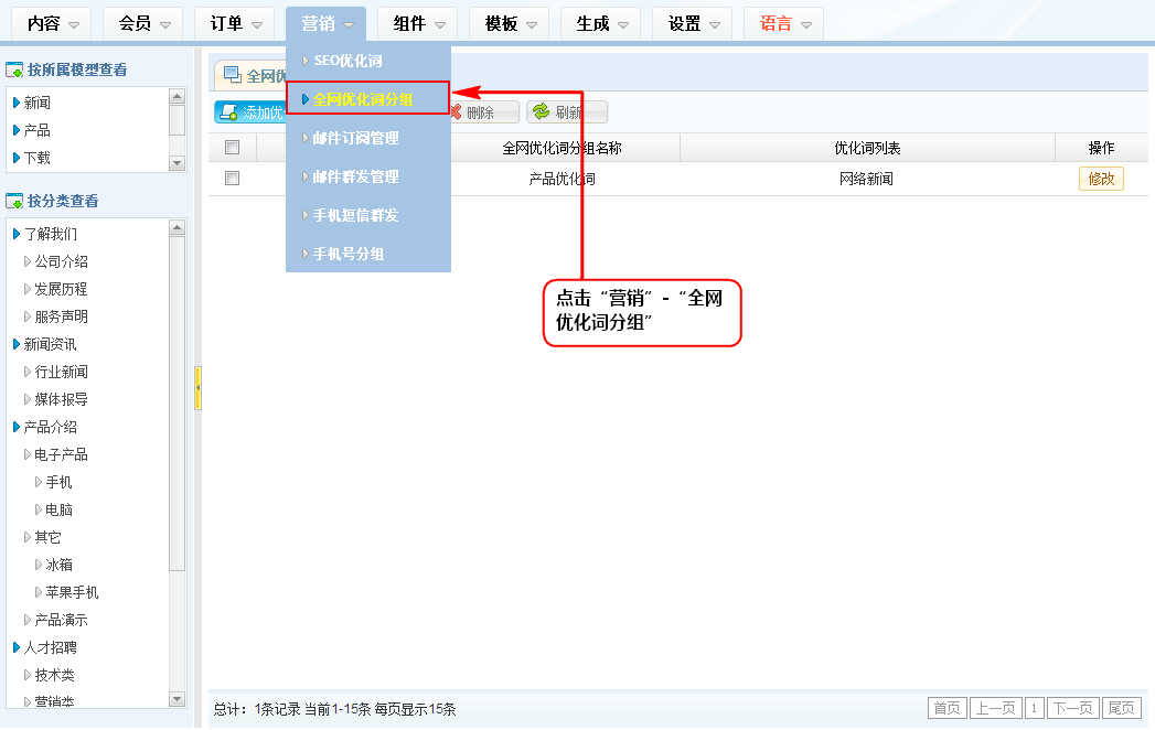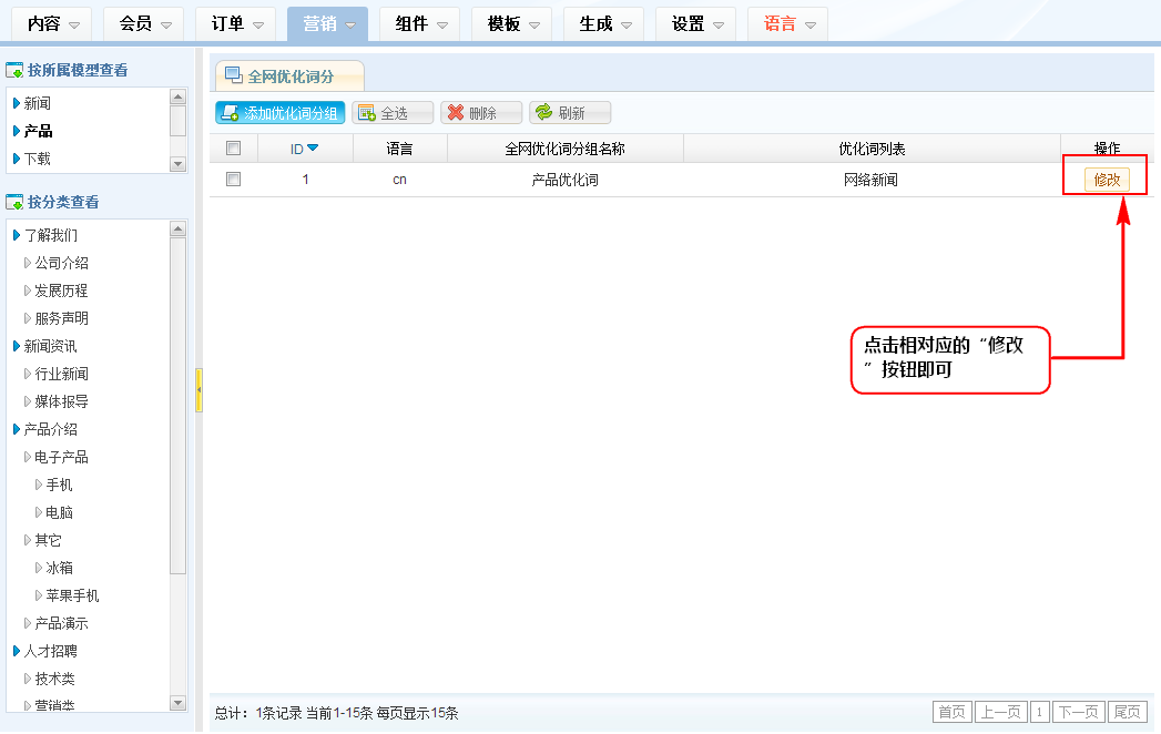 2、在全网优化词分组列表区双击您要修改的全网优化词分组,或者点击相对应的“修改”按钮即可。
