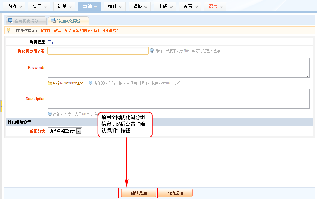3、在出来的优化词分组添加窗口中,添加全网优化词分组信息,然后点击“确认添加”按钮。