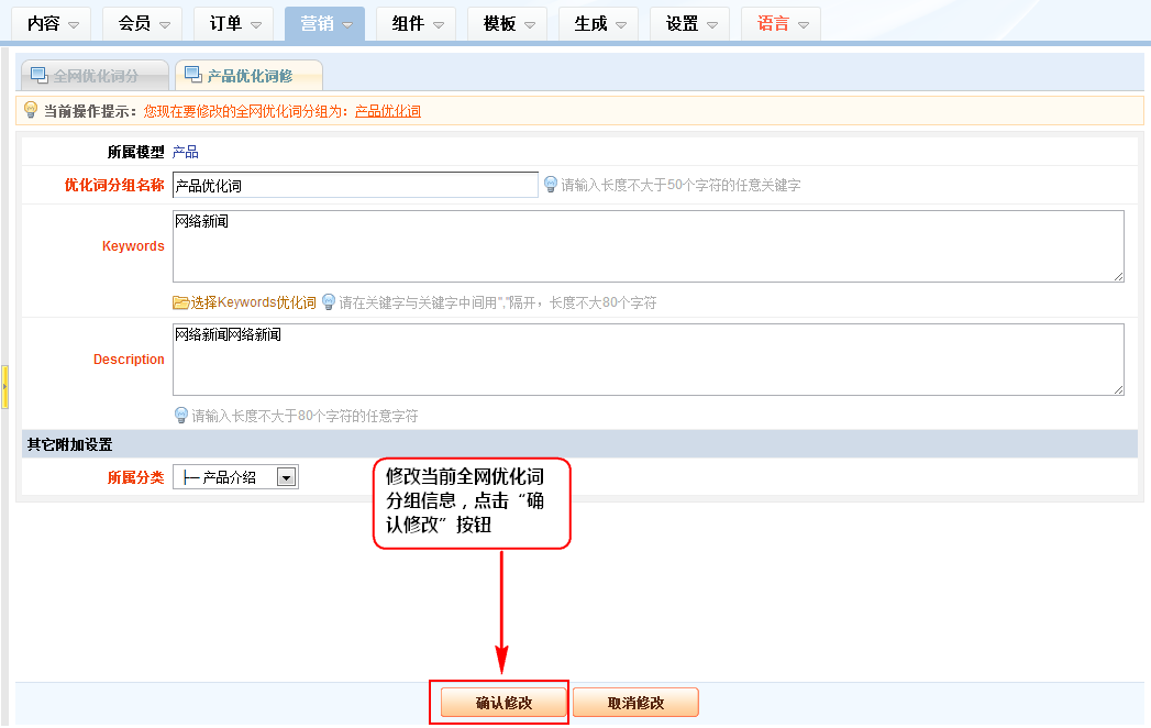 3、在出来的全网优化词分组修改窗口中,修改当前全网优化词分组信息,点击“确认修改”按钮。