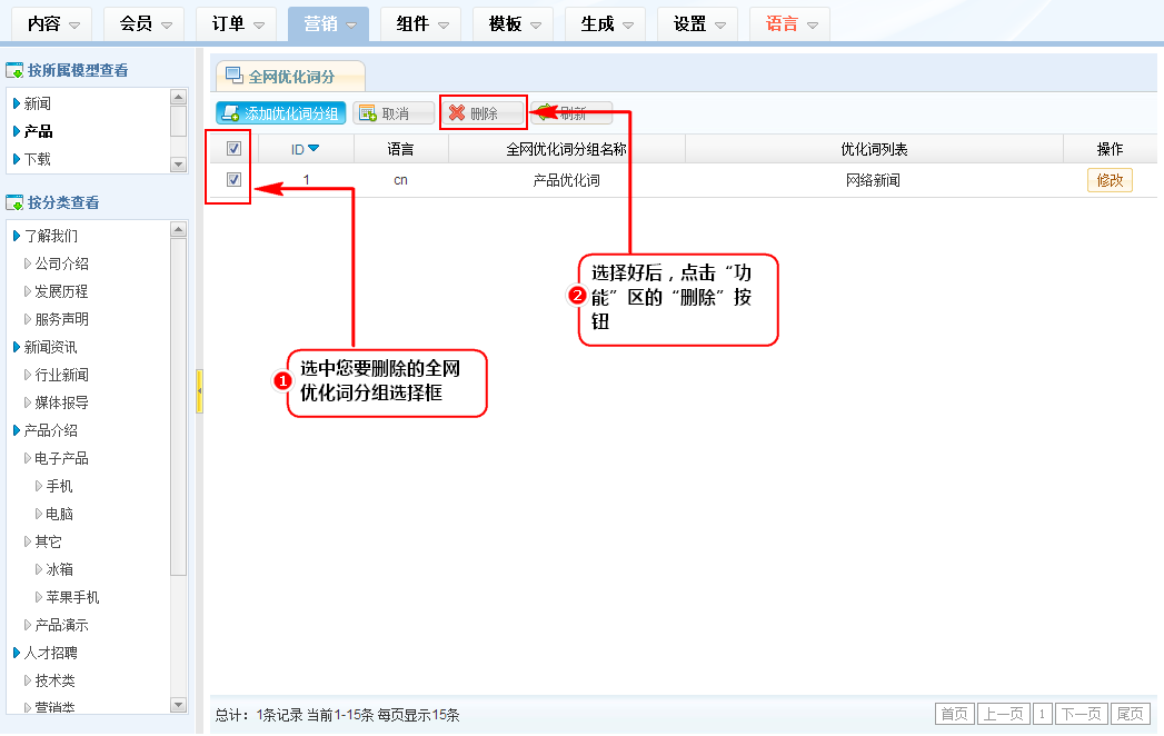 2、在全网优化词分组列表区,选中您要删除的全网优化词分组选择框,选择好后,点击“功能”区的“删除”按钮。